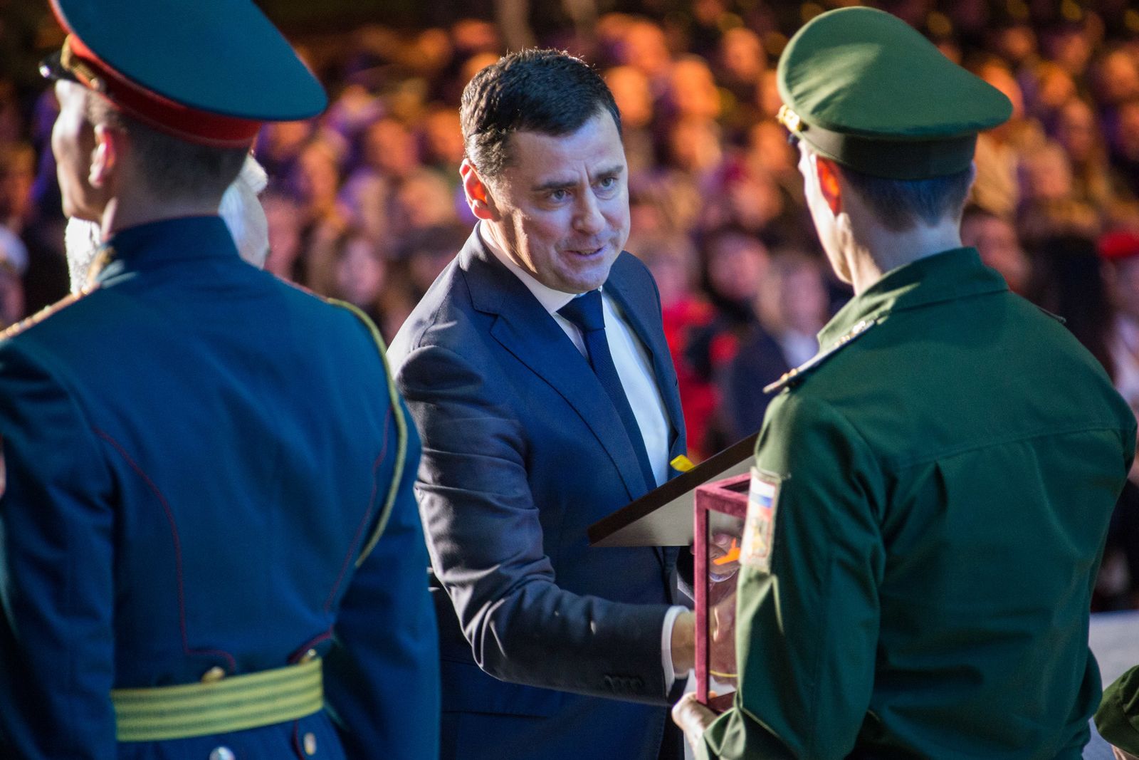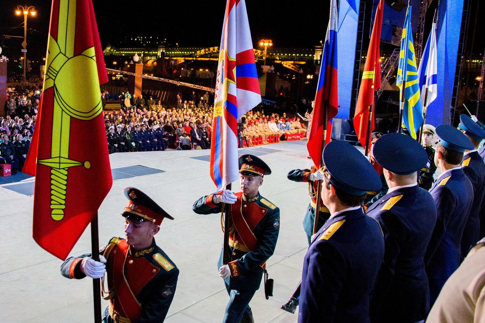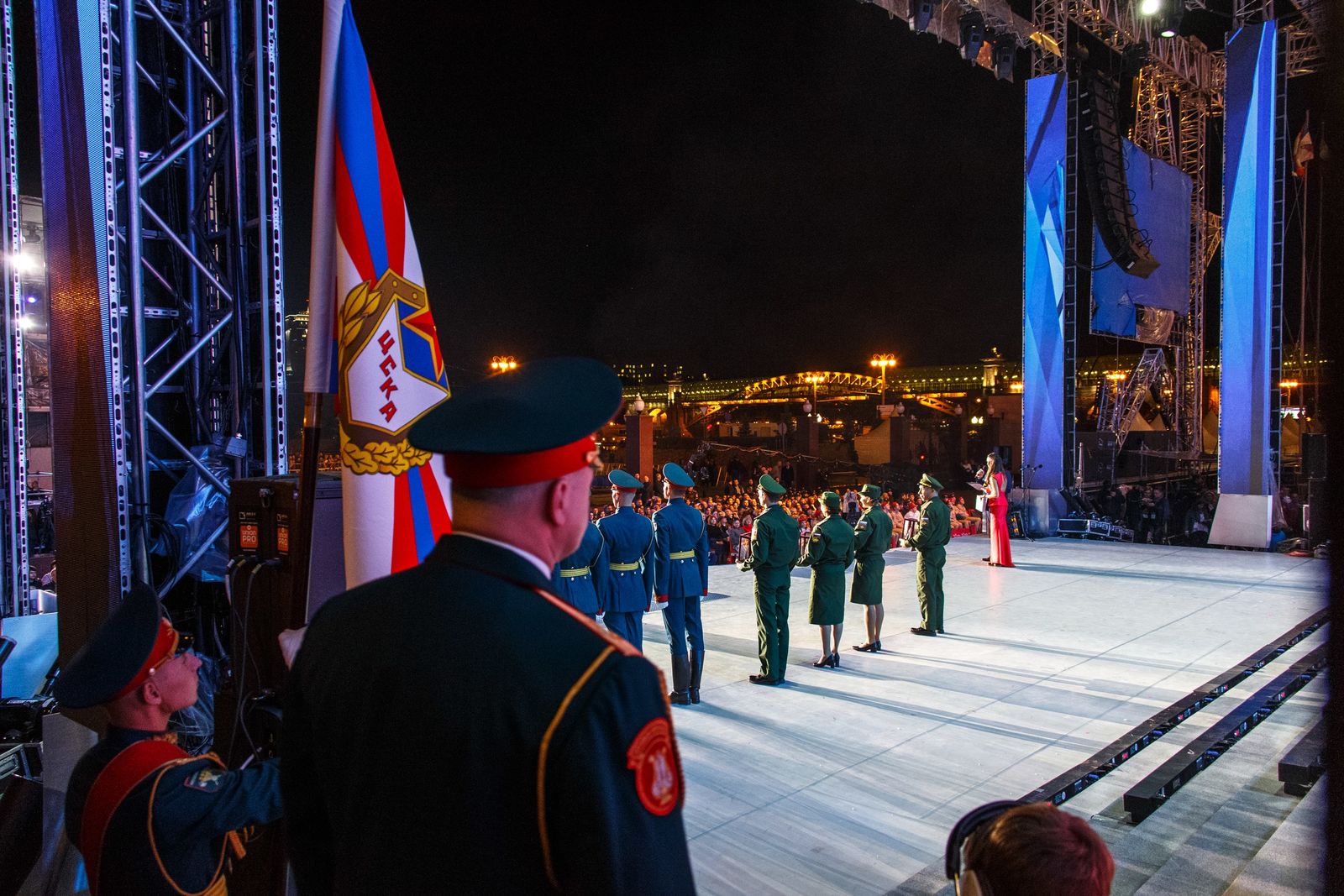 Церемония награждения прошла на открытой сцене у здания Национального центра управления обороной РФ. В ней принял участие министр обороны РФ, Герой России генерал армии Сергей Шойгу.