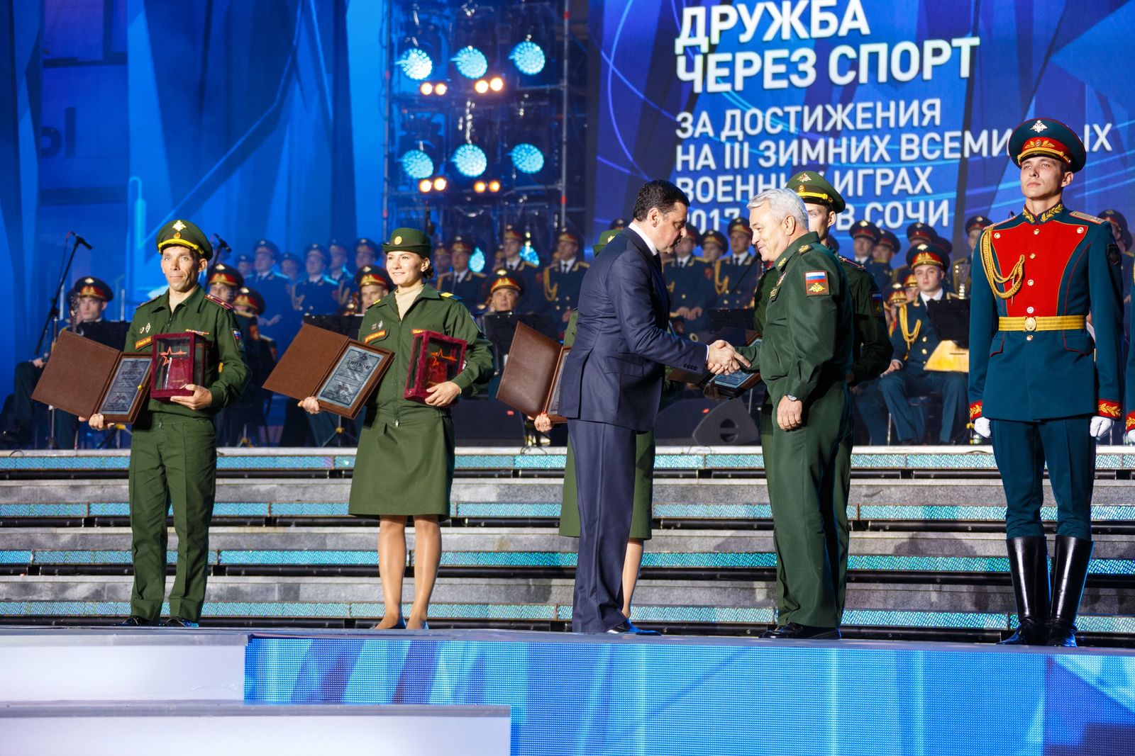 В номинации «Дружба через спорт» за достижения на III зимних Всемирных военных играх 2017 года в Сочи, проявленную волю к победе и железный характер памятными призами были награждены спортсмены ЦСКА майор Эдуард Хренников (ориентирование на лыжах), старший лейтенант Наталья Коростелева (лыжные гонки), лейтенант Максим Цветков (биатлон) и сержант Анна Цыганова (скалолазание).