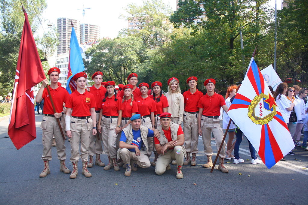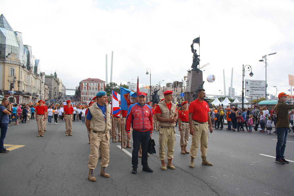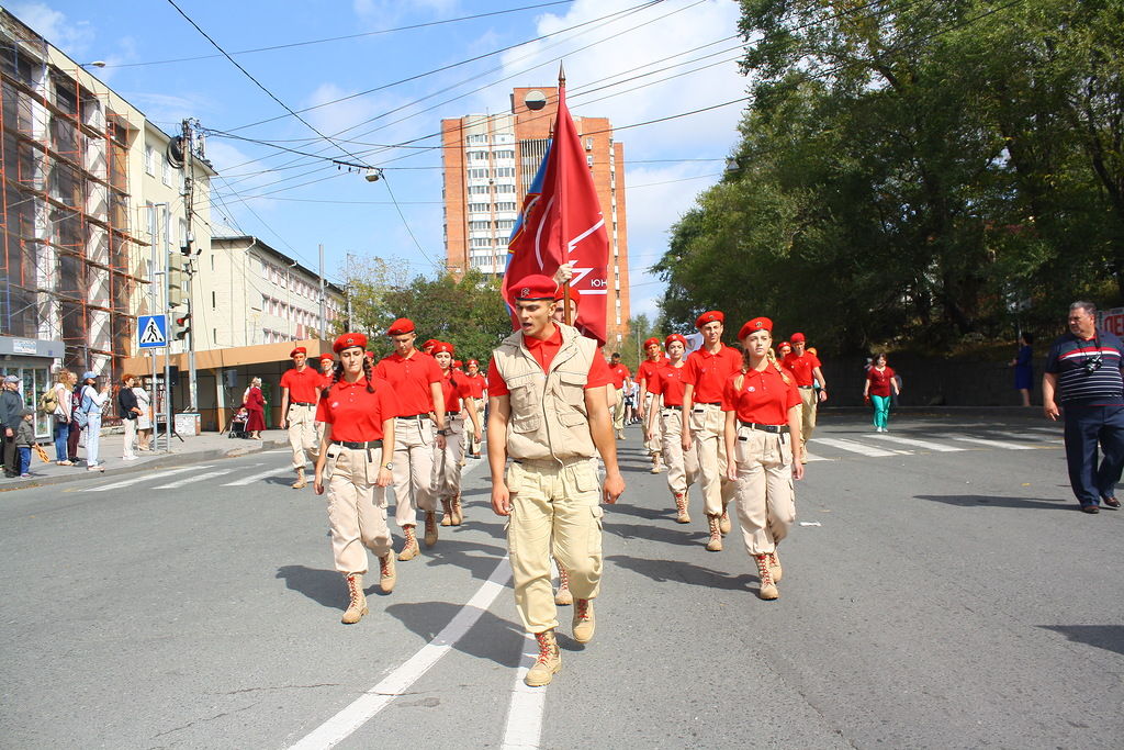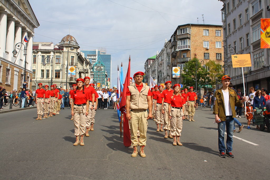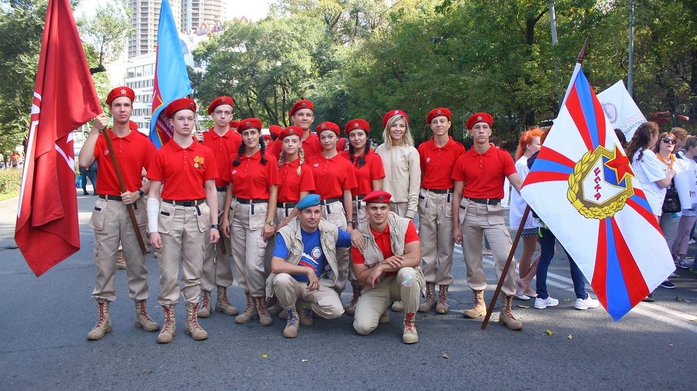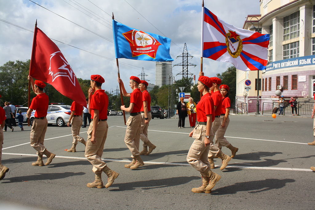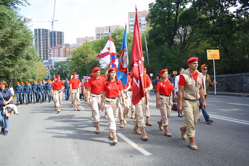 В колонне юнармейцев вместе с ребятами вместе шли начальник филиала ЦСКА/Хабаровск Григорий Туров, руководитель Приморского отделения ДОСААФ Игорь Доценко и сотрудники «Юнармии» – куратор движения по Дальневосточному федеральному округу Дмитрий Минязев и начальник регионального штаба «Юнармии» Богдан Юрчук.