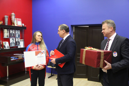 В ходе встречи грамотой и ценным подарком была награждена чемпионка Европы-2016 по боксу Александра Ордина. Она сказала много добрых слов ветеранам армейского клуба.