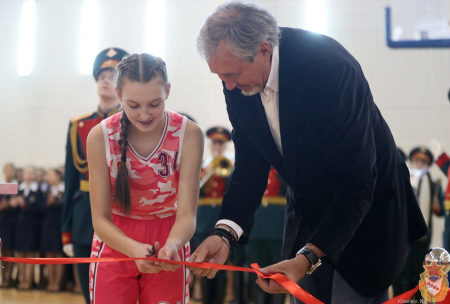 Почетное право перерезать символическую ленточку было предоставлено Сергею Николаевичу Тараканову и ученицам спортивных классов. После чего воспитанницы зачитали клятву баскетболиста.