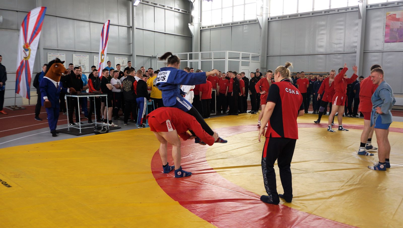 Азы самбо с ребятами отрабатывала двукратная чемпионка мира, чемпионка Европы, восьмикратная чемпионка России по самбо старший лейтенант ВС РФ Наталья Казанцева.