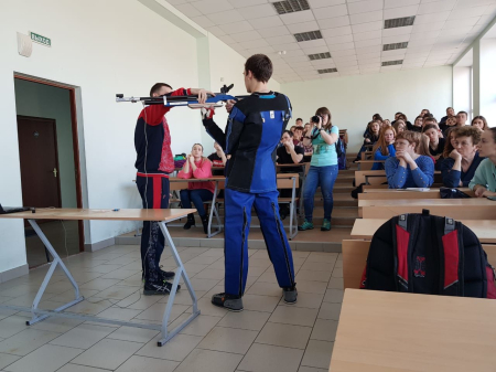 На встрече с армейскими стрелками присутствовали более 200 учащихся СибГУФКа. С большим интересом студенты слушали рассказы профессионалов о виде спорта, о правильной технике стрельбы из разного вида оружия и о подготовке к соревнованиям. Многих интересовало умение правильного настроя перед турнирами и борьба с волнением. После теоретической части встречи, прошло и практическое занятие по стрельбе.