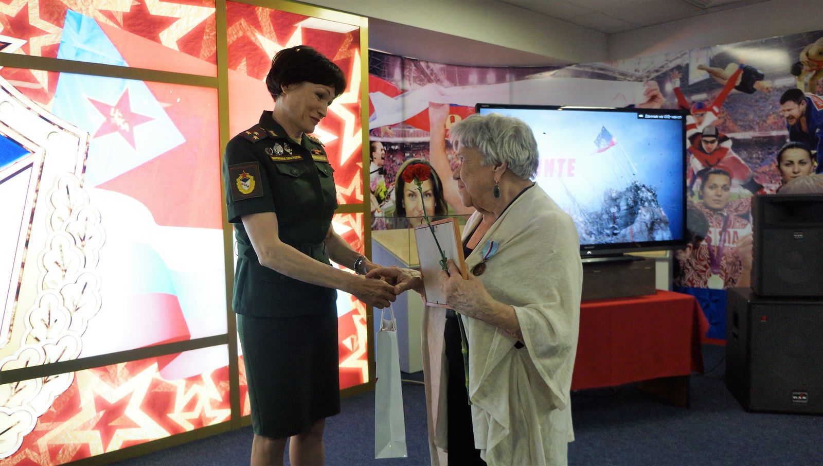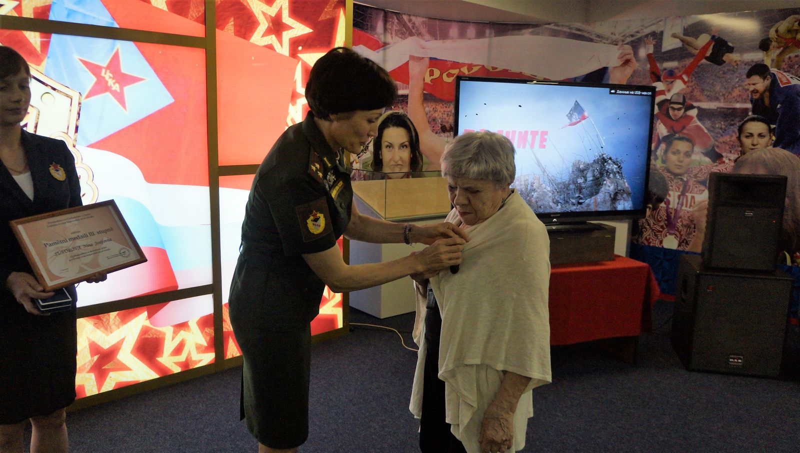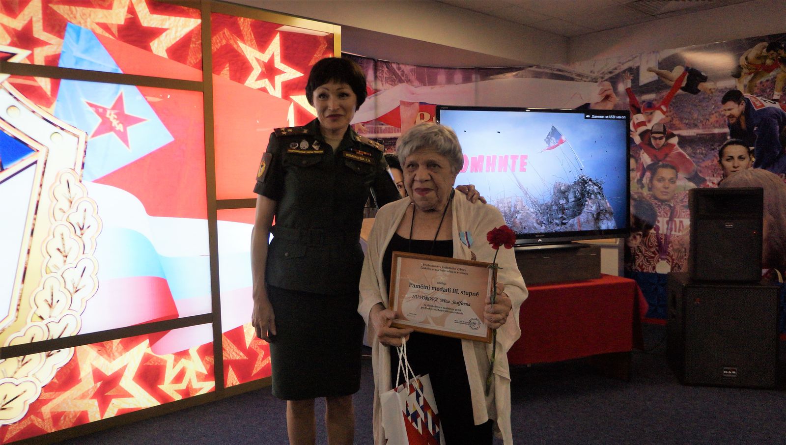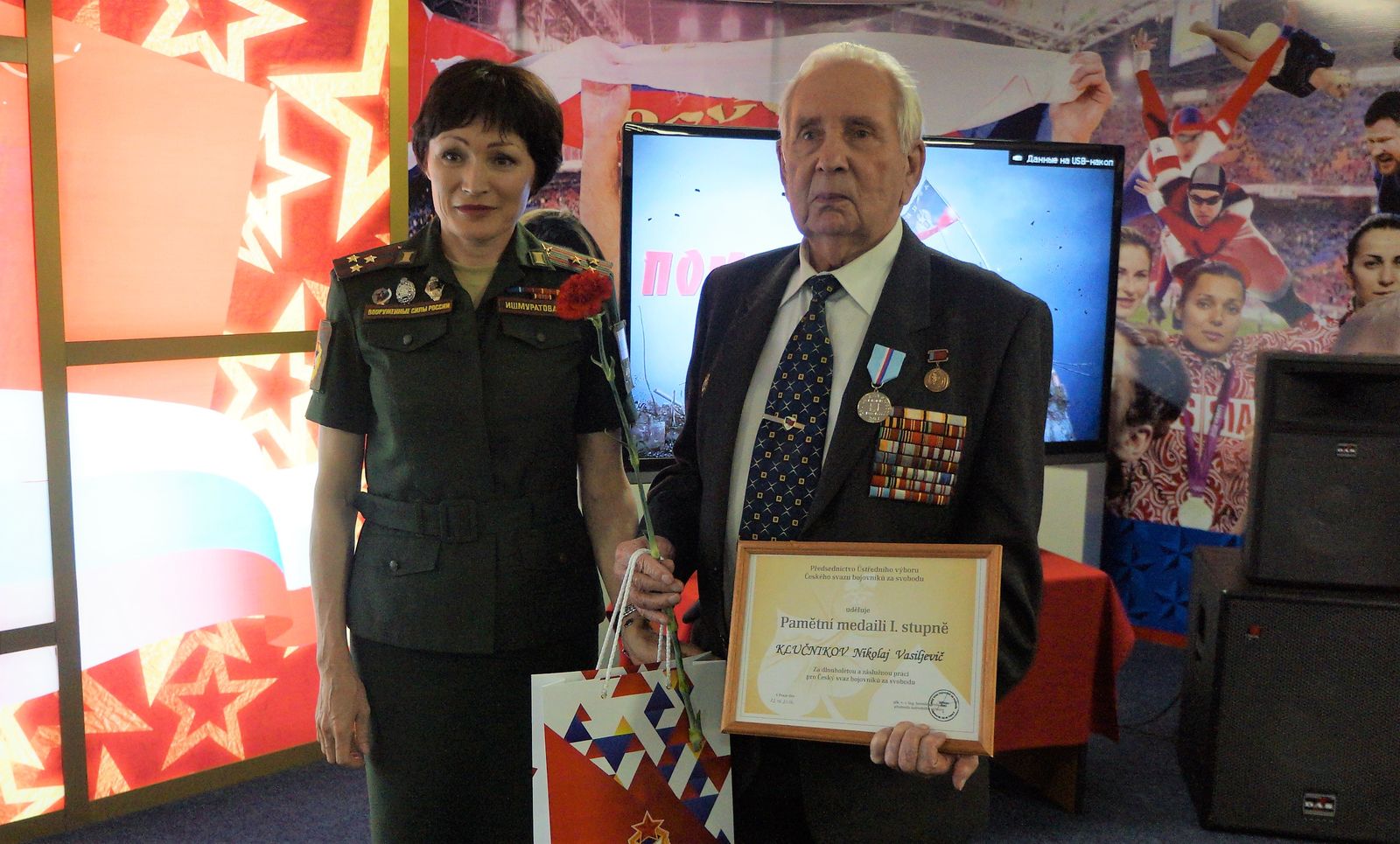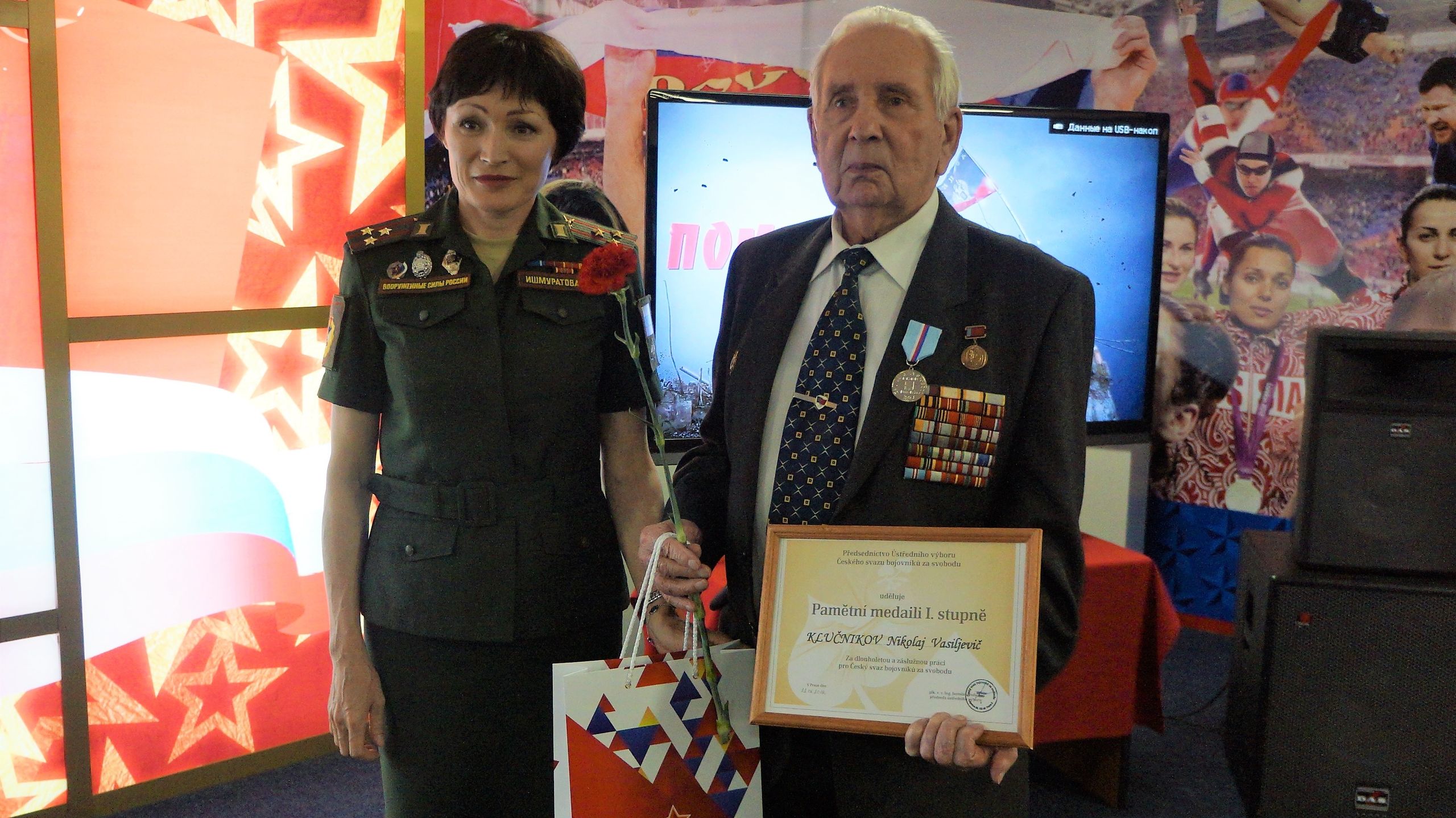В рамках памятного мероприятия полковник Светлана Ишмуратова вручила представителям армейского Клуба – участникам Великой Отечественной войны, труженикам тыла и детям войны – узнику концлагеря, почетному члену Президиума Совета ветеранов спорта ЦСКА старшему лейтенанту Михаилу Моисеевичу Бурштейну и ветерану Великой Отечественной войны, почетному члену Президиума Совета ветеранов спорта ЦСКА полковнику Николаю Васильевичу Ключникову, а также работникам армейского клуба, награжденным медалями «За доблестный труд в период Великой Отечественной войны 1941-1945гг.»: Ирине Алексеевне Сухановой и Инне Иосифовне Суворовой – памятные медали от Центрального комитета Чешского Союза Борцов за Свобод. Наград также удостоены участник Великой Отечественной войны, начальник ЦСКА (1976-1982), почетный член Президиума «Совета ветеранов спорта ЦСКА» полковник Иван Кириллович Покусаев и труженик тыла, награждённый медалью «За доблестный труд в период Великой Отечественной войны 1941-1945гг.», Любовь Никитична Гончарова, которые, к сожалению, не смогли присутствовать на торжественном собрании.
