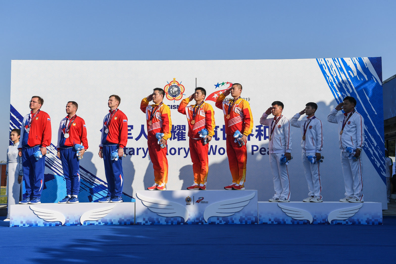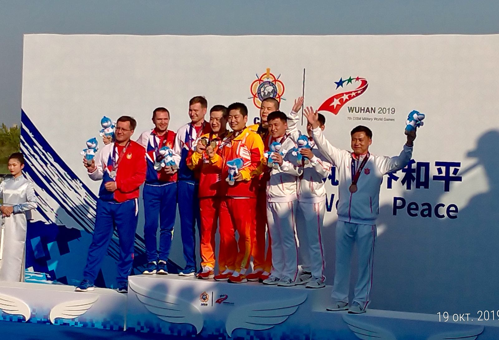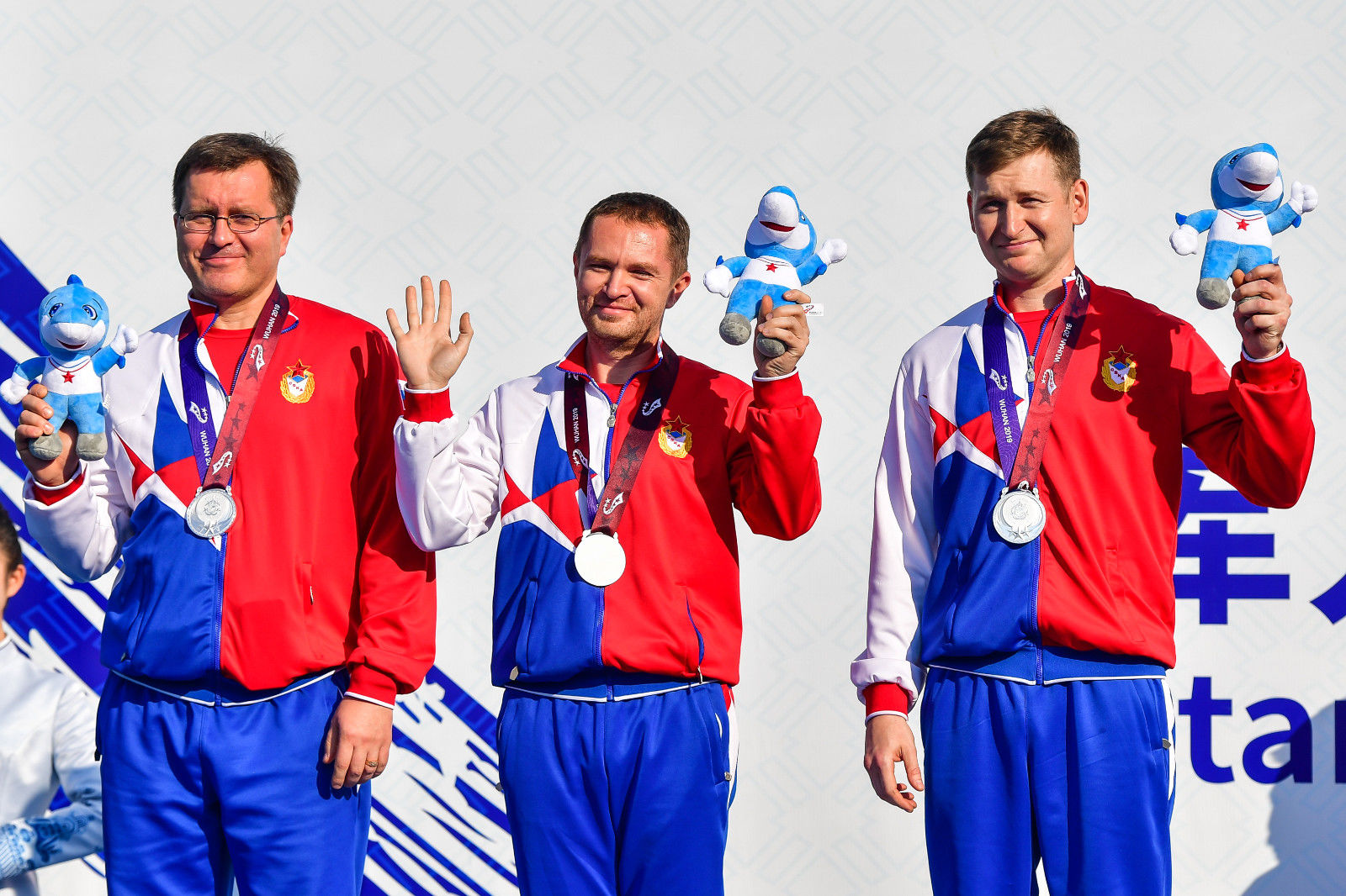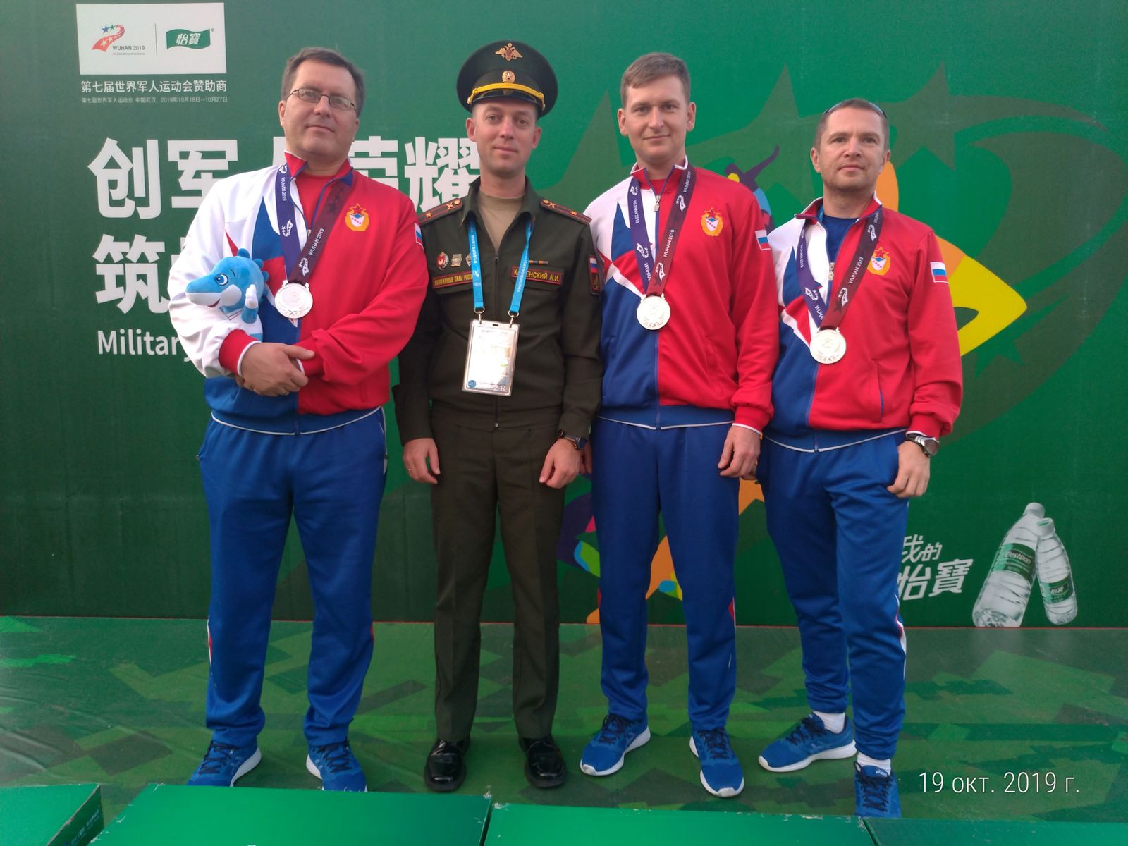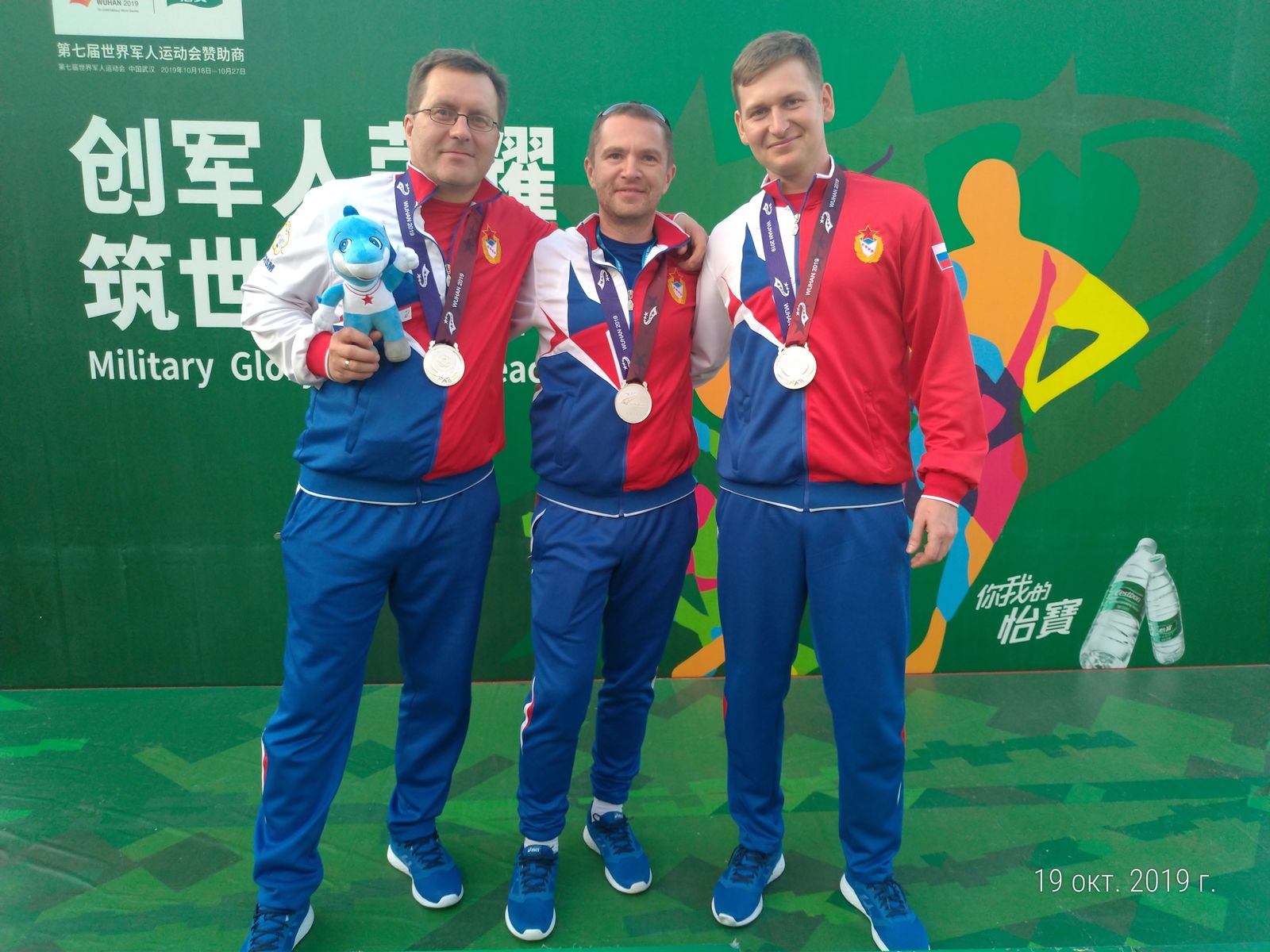 Стрелки лейтенант Леонид Екимов, майор Алексей Климов и лейтенант Антон Гурьянов в упорной борьбе завоевали серебряную награду VII Всемирных военных играх в командном мужском упражнении «скорострельный малокалиберный пистолет, 25м».