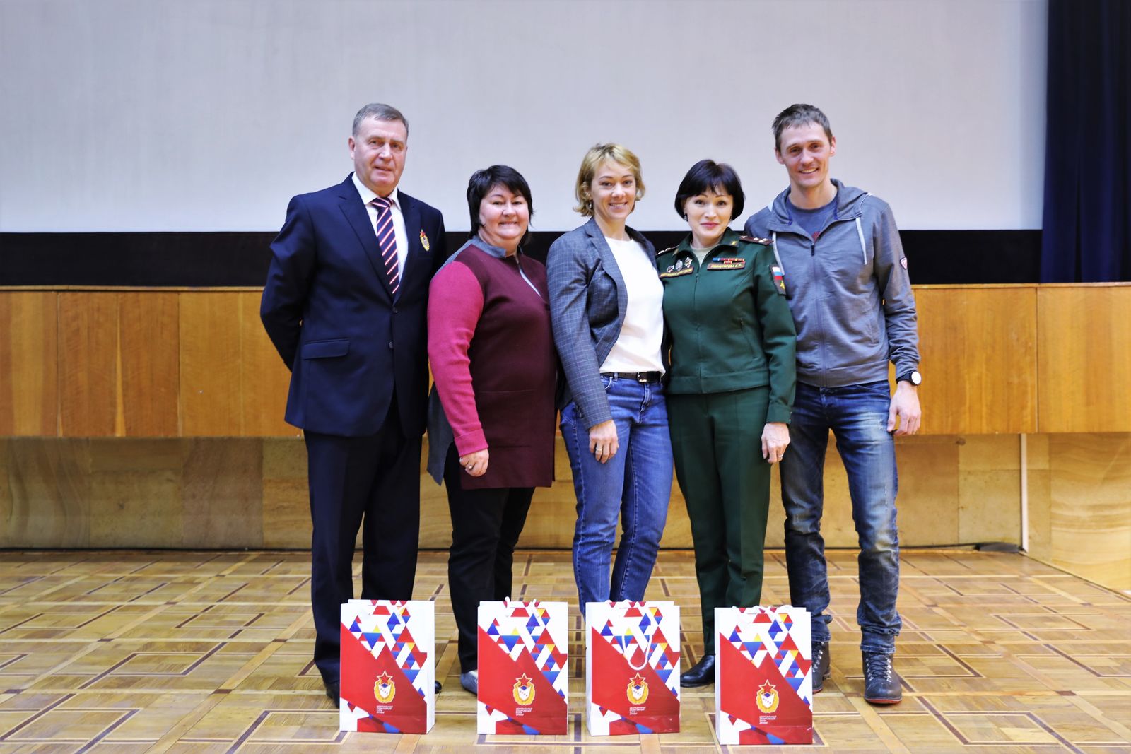 Когда все именитые гости поделились опытом и приятными воспоминаниями и пожелали юным спортсменам всевозможных успехов, Светлана Ирековна Ишмуратова пригласила их на сцену, чтобы передать подарки от Центрального спортивного клуба Армии. «12 олимпийских медалей на одной сцене, друзья!» - подметил ведущий.