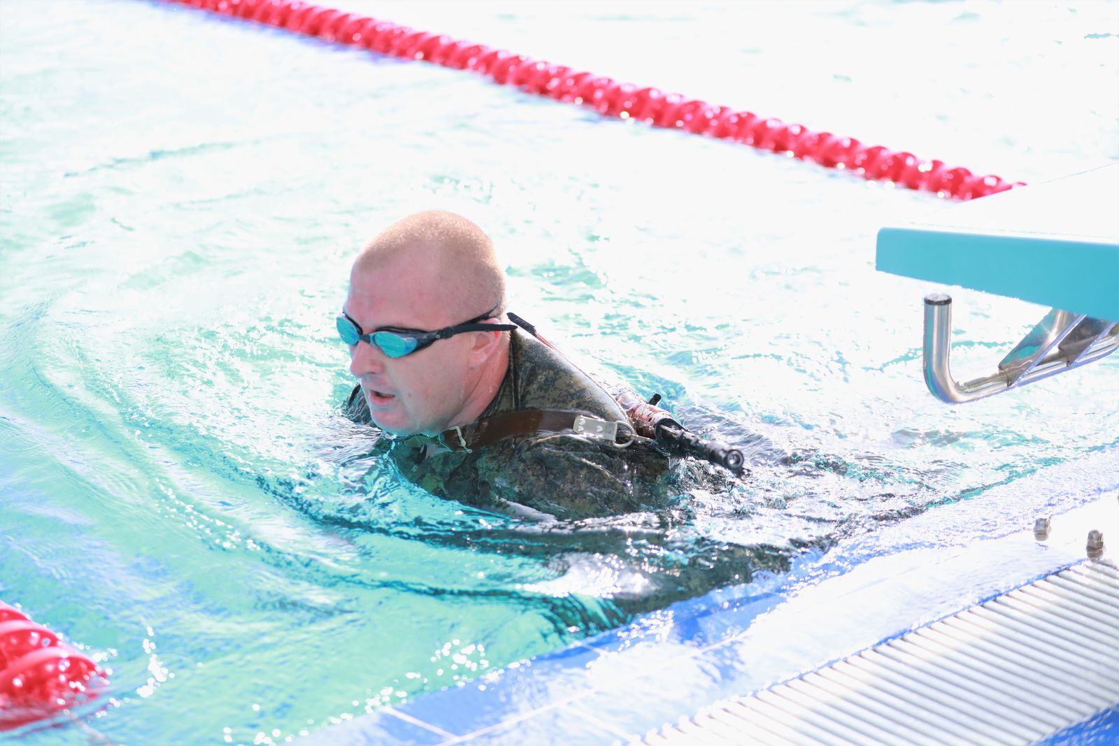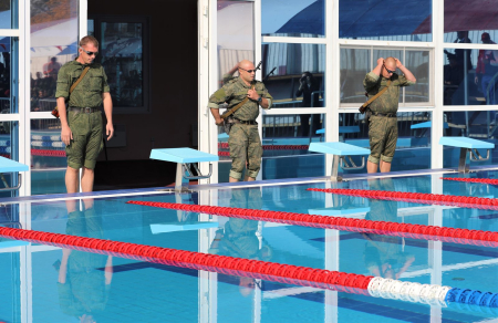 Продолжилась церемония ярким выступлением военнослужащих 185 Центра боевой подготовки и боевого применения ВКС - плаванием с оборудованием и оружием вольным стилем и брассом, наглядно демонстрирующим высокую физическую подготовку и собранность.