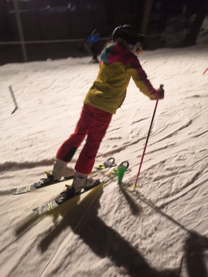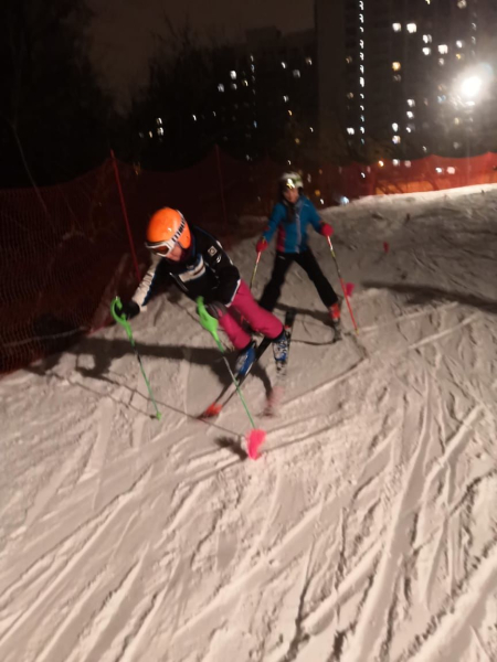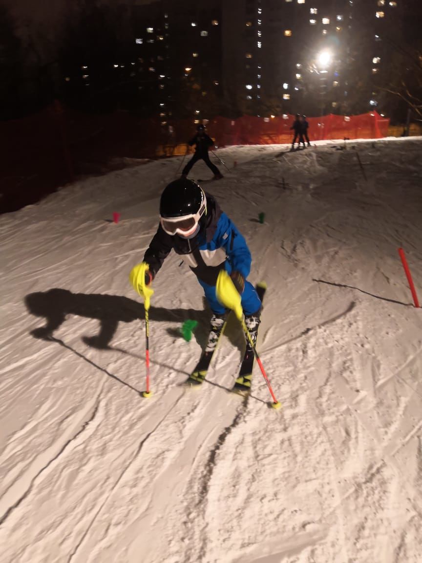 На данный момент воспитанники тренируются на детской горке, которая называется «бэби». На таком склоне можно сделать очень много разных упражнений и удобно исправлять ошибки, потому что он пологий и скорость на нем развивается маленькая. Сейчас воспитанники отрабатывают стартовый рывок, езду на одной лыжные, правильную постановку ног и наклон коленей.