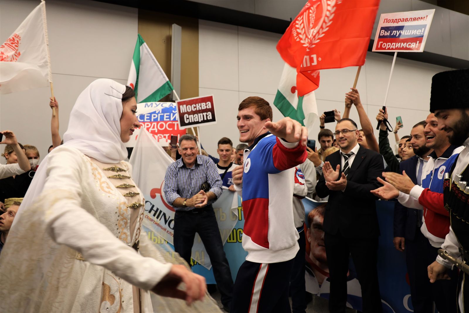Рейс совершил посадку в аэропорту Шереметьево в 15:35 мск. В честь победы борца собравшиеся под одобрительные выкрики устроили национальные танцы.