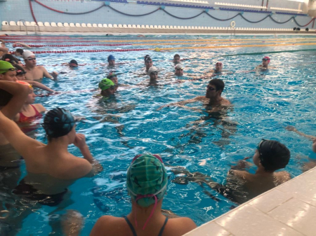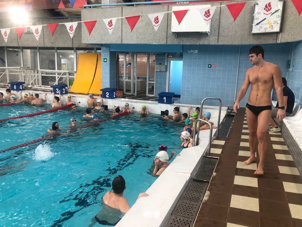 Встреча прошла не случайно: Евгений Лагунов вместе с командой сборной Вооруженных Сил по плаванию находиться в СК (Плавательном) на чемпионате ВС РФ по водно-спасательному многоборью. Он рассказал юным пловцам как из обычного мальчика он смог стать спортсменом мирового уровня.