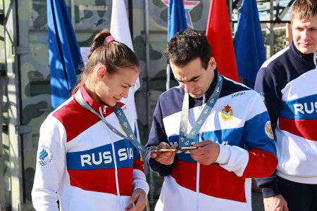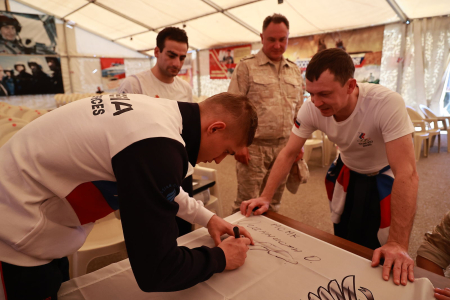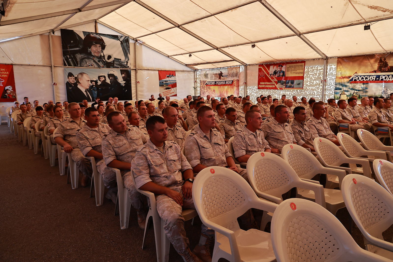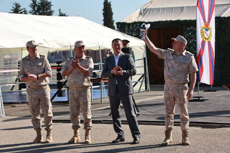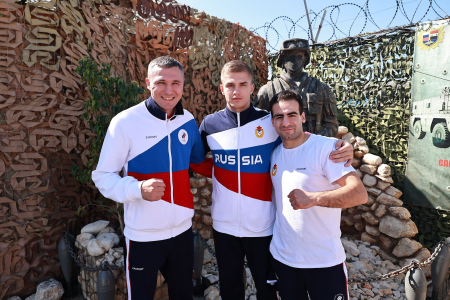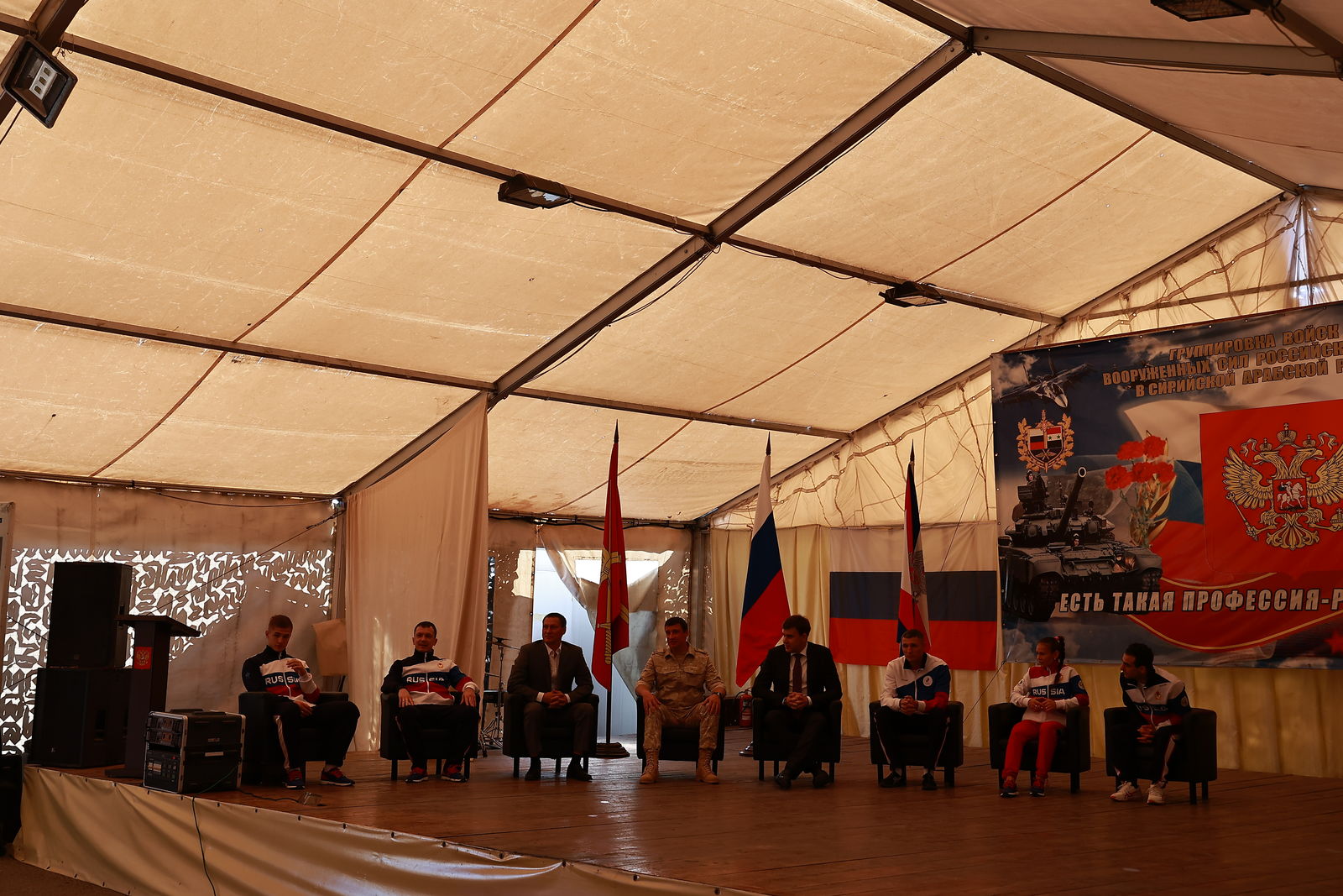 На авиабазу в Сирию прилетела внушительная делегация спортсменов ЦСКА и представителей Федерации бокса России - двукратный олимпийский чемпион по боксу Олег Саитов, двукратный бронзовый призер Олимпийских игр по боксу, победитель и призер чемпионатов мира, победитель Универсиады Андрей Замковой, победитель VII летних Всемирных военных игр, бронзовый призер чемпионата Европы, победитель 58-го чемпионата мира среди военнослужащих старший лейтенант ВС РФ Овик Оганнисян, победитель VII летних Всемирных военных игр, серебряный призёр 58-го чемпионата мира среди военнослужащих рядовой Алексей Семыкин, чемпионка мира, победительница 58-го чемпионата мира среди военнослужащих прапорщик Екатерина Пальцева, а также заместитель начальника Центрального спортивного клуба Армии по спортивной работе полковник Олег Пархоменко, генеральный секретарь Федерации бокса России Кирилл Щекутьев.
