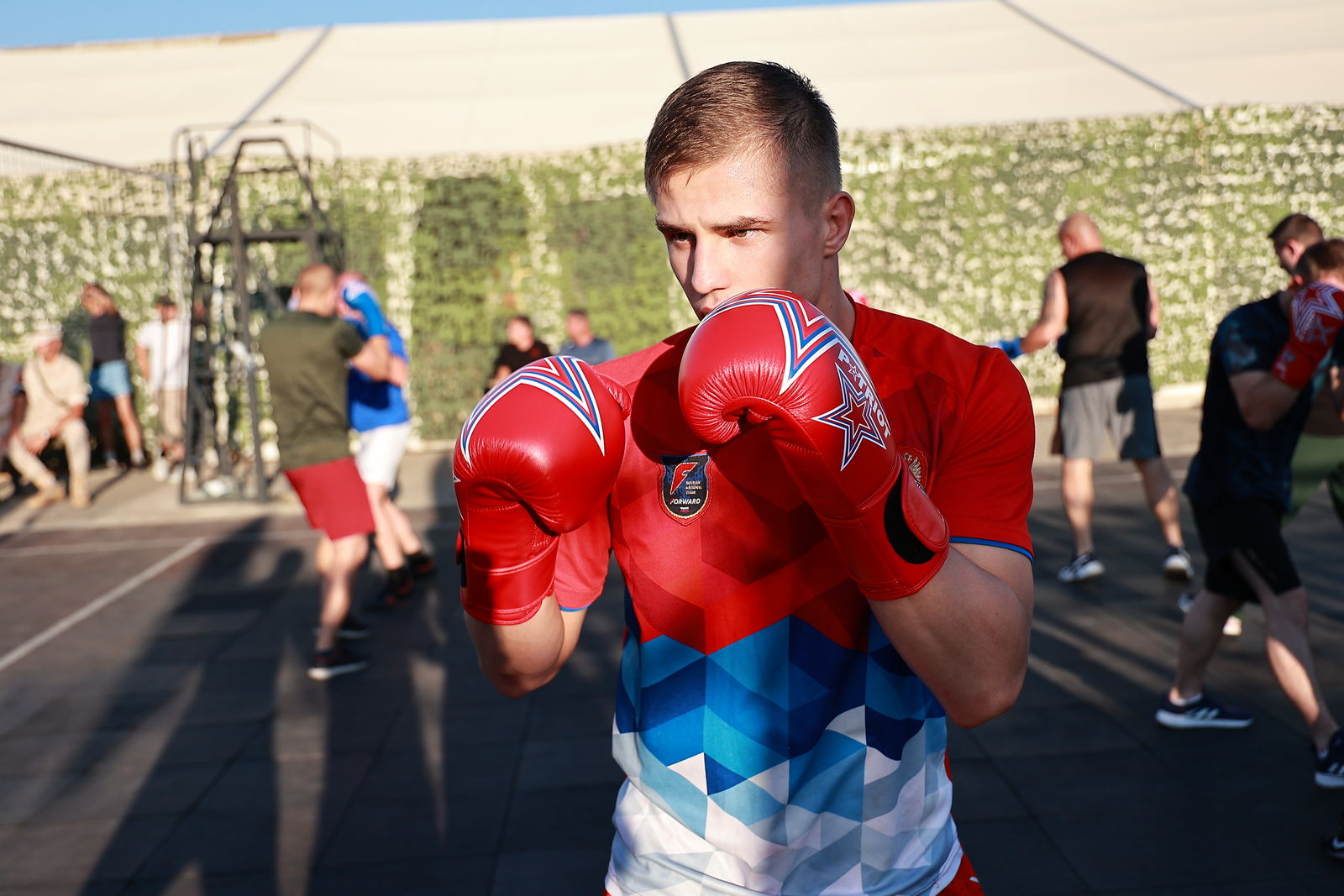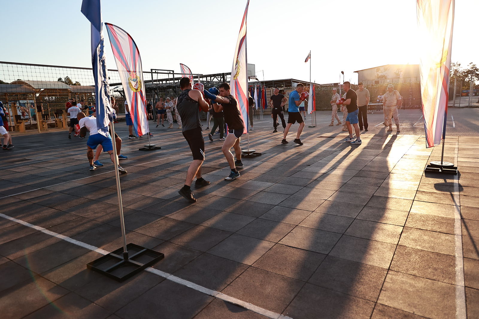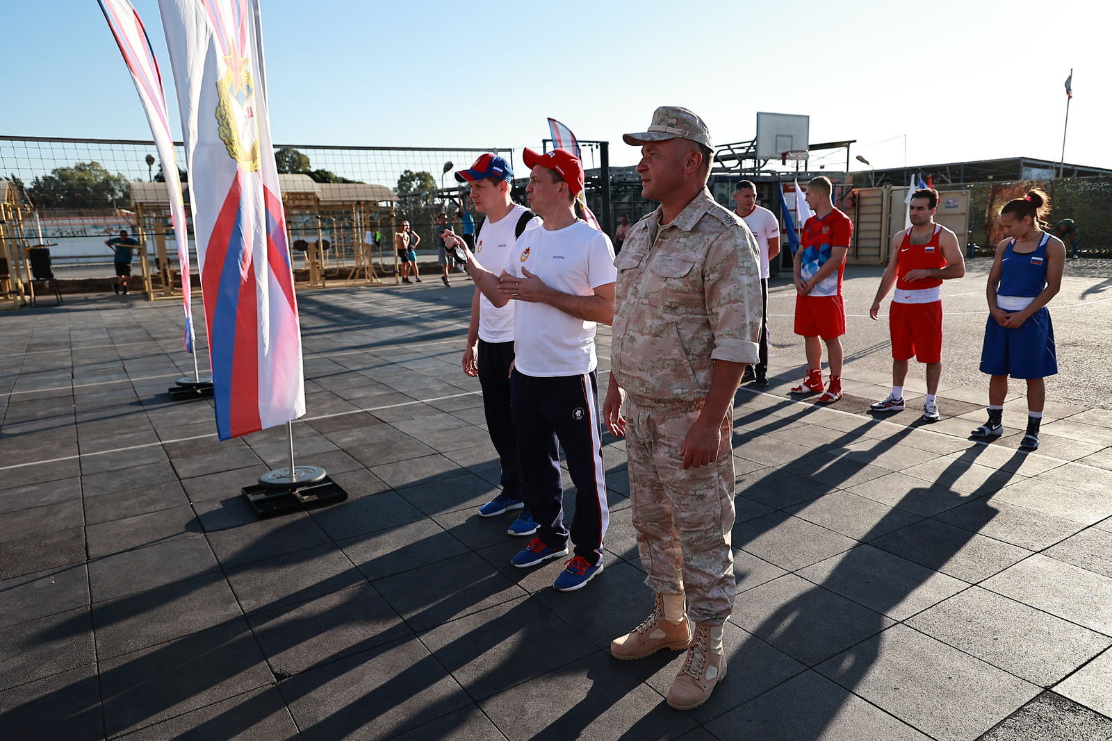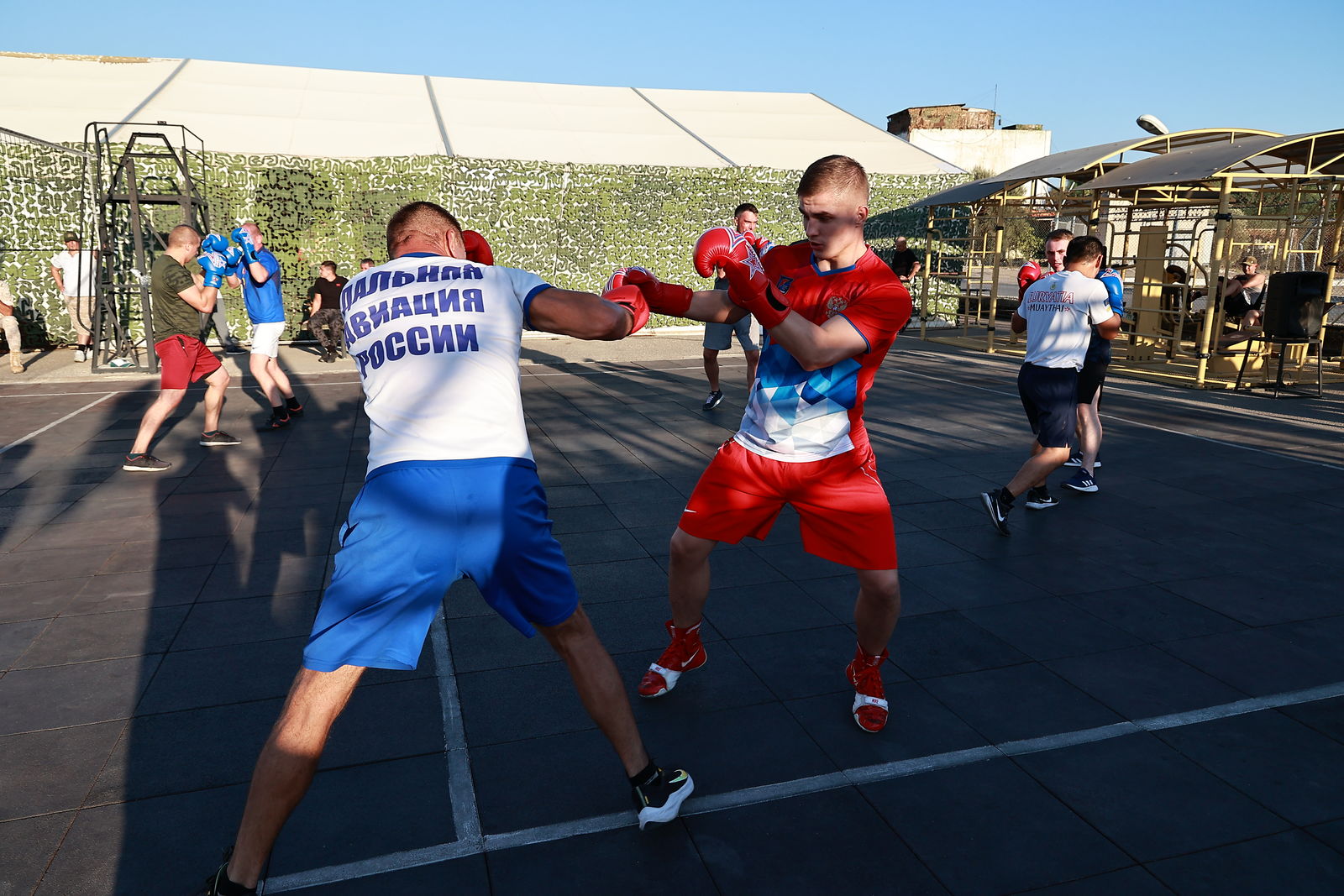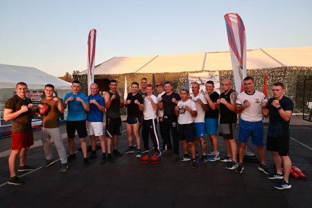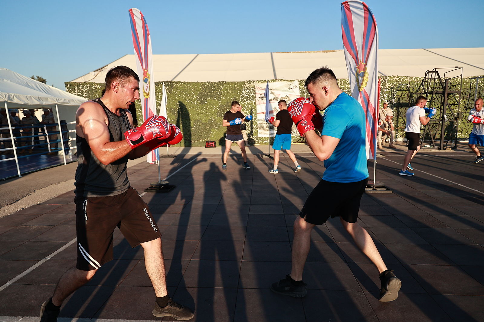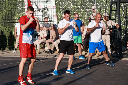 Во второй половине дня, как только немного спала сильная жара, личный состав во главе с армейскими боксерами провели полноценную тренировку. Спортсмены показали военнослужащим важные и необходимые упражнения для разминки, уделив особое внимание растяжке и разогреву всех групп мышц. Затем перешли уже к работе в парах и даже небольшим спаррингам.
