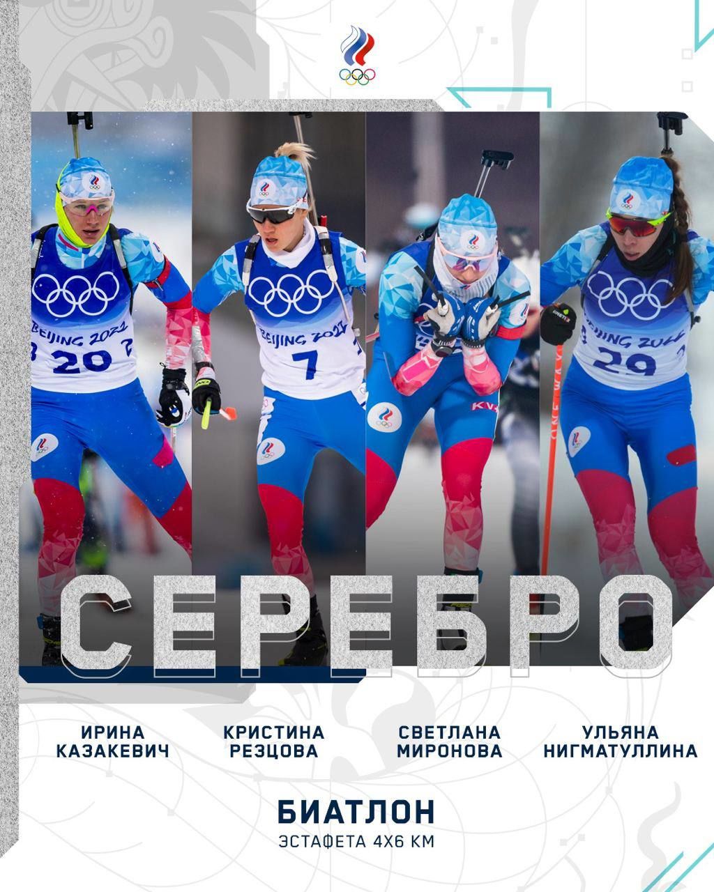 Биатлонистки Центрального спортивного клуба Армии - прапорщик Ирина Казакевич, прапорщик Светлана Миронова, прапорщик Ульяна Нигматуллина и Кристина Резцова заняли второе место по итогам эстафеты 4х6 км на Олимпийских играх в Пекине.