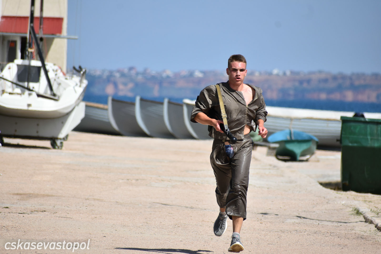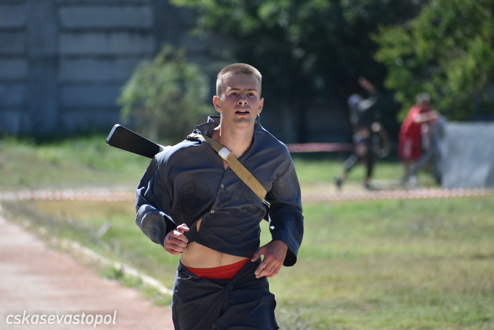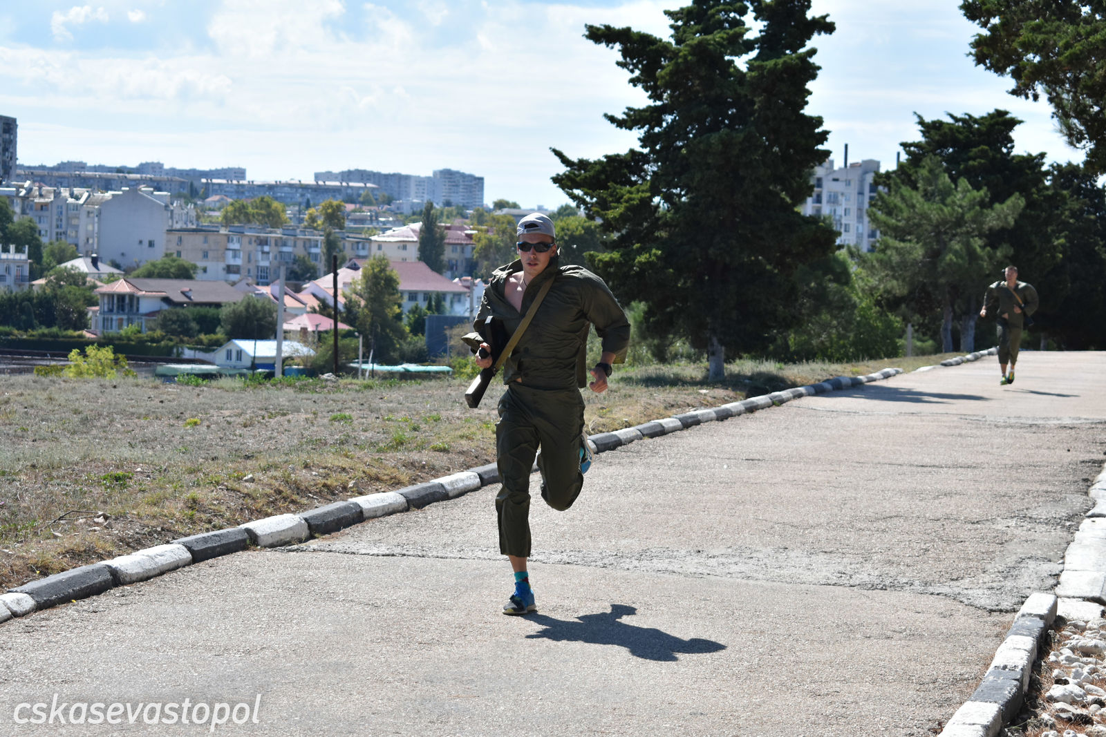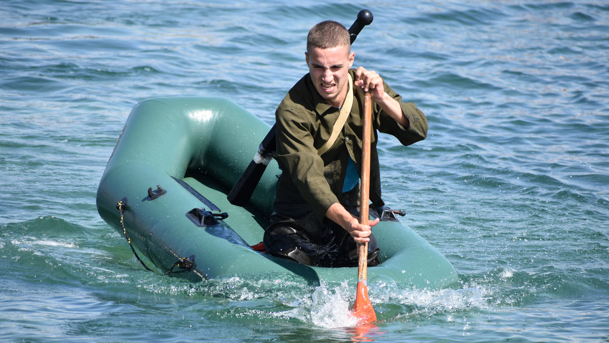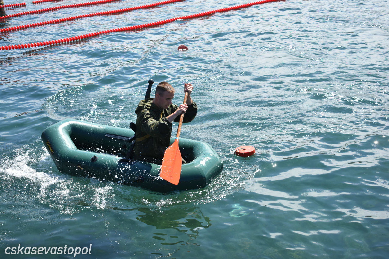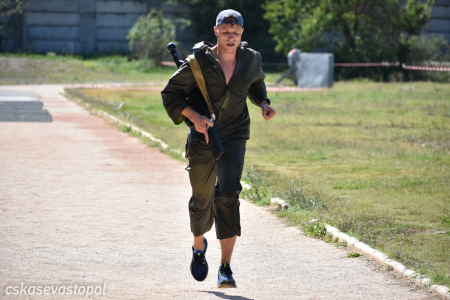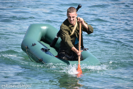 После старта военнослужащие и курсанты бежали в тир. Задача – стрелять из малокалиберной винтовки и с 50 метров попасть по 5 мишеням диаметром 100 мм. Следующий пункт – водная станция. На надувных лодках с одним веслом они должны были пройти 50 метров до буйка и обратно. Последнее упражнение – метание гранаты. Всю дистанцию мужчины преодолевали в робе с макетом автомата на спине, девушки – в спортивных костюмах без автомата.