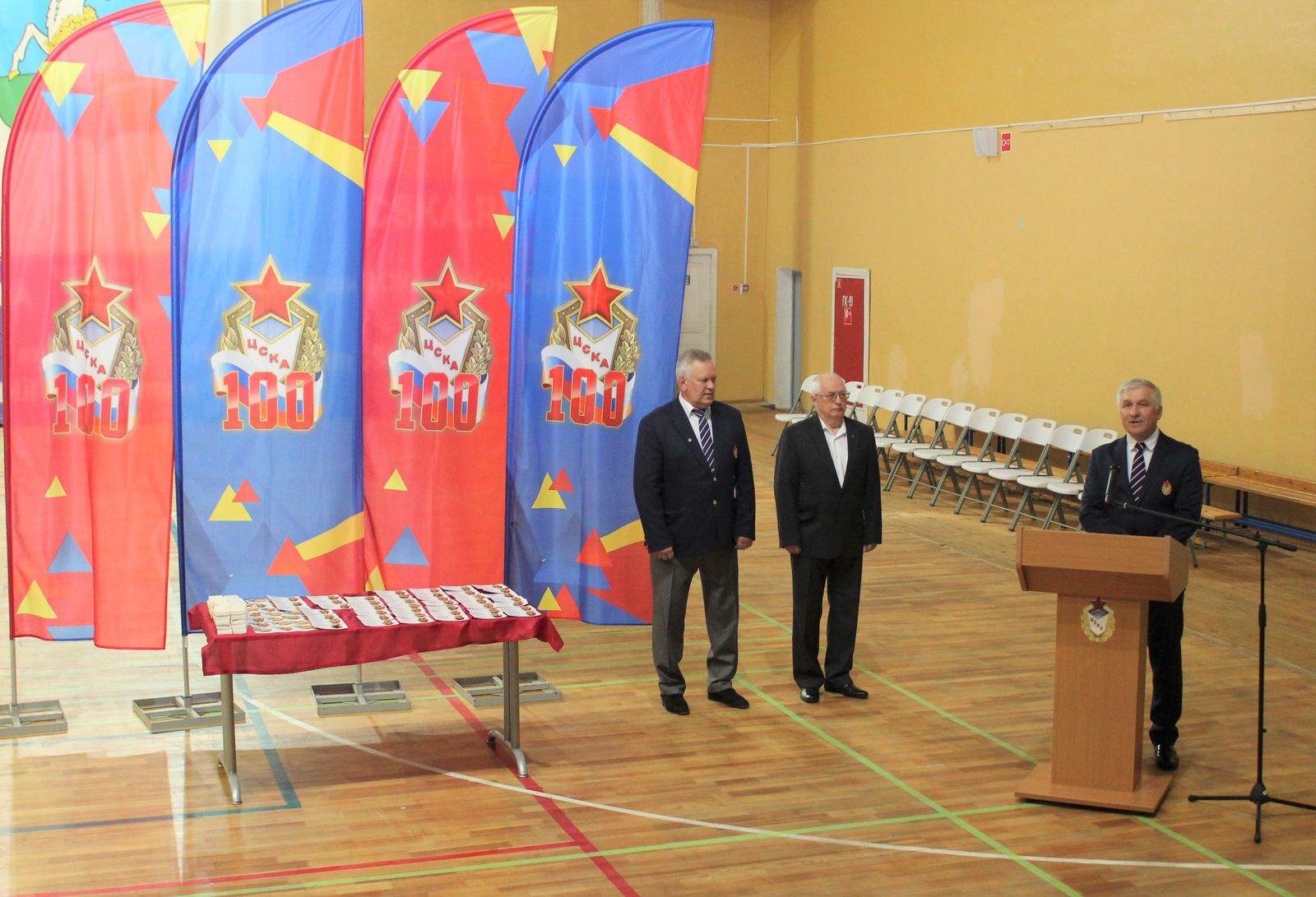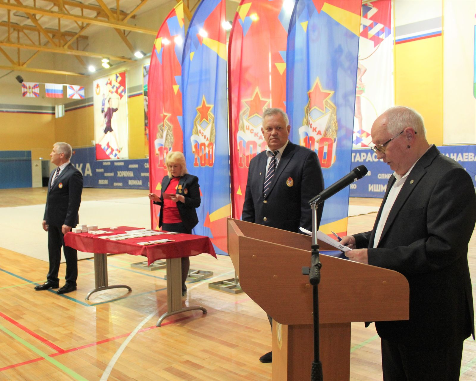 С приветственным словом выступил начальник спортивного центра (г. Одинцово) Заслуженный работник физической культуры Российской Федерации Сергей Николаевич Дуюнов. Он поздравил присутствующих с вековым юбилеем Центрального спортивного клуба Армии.