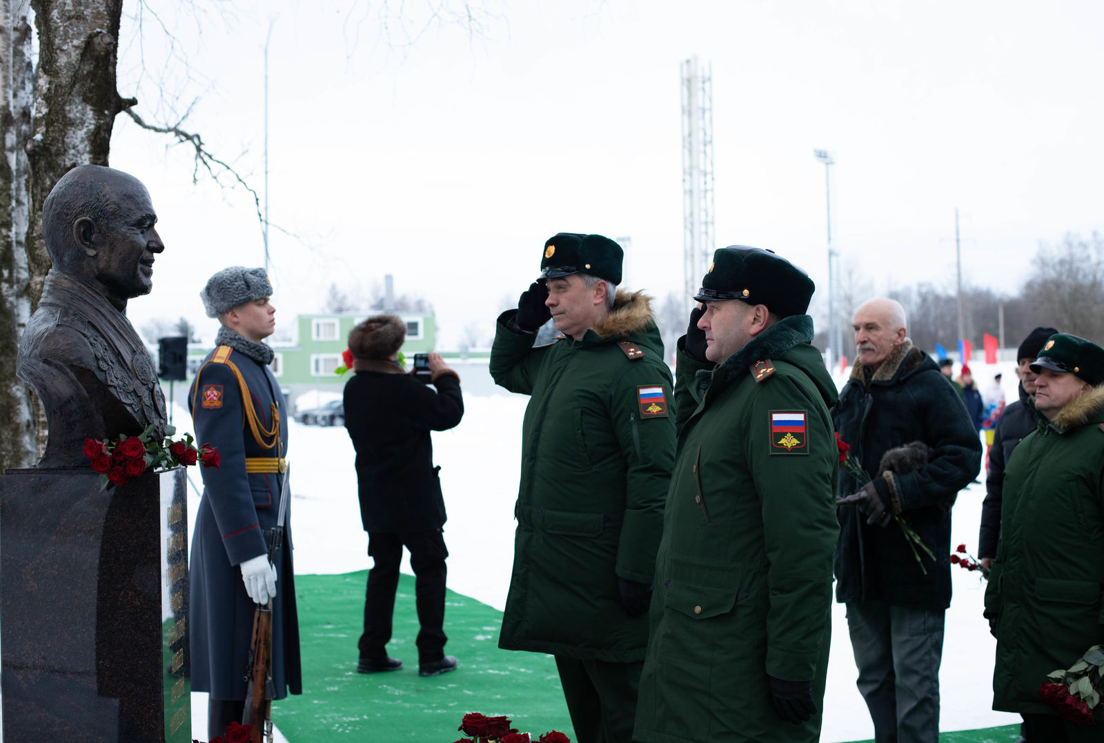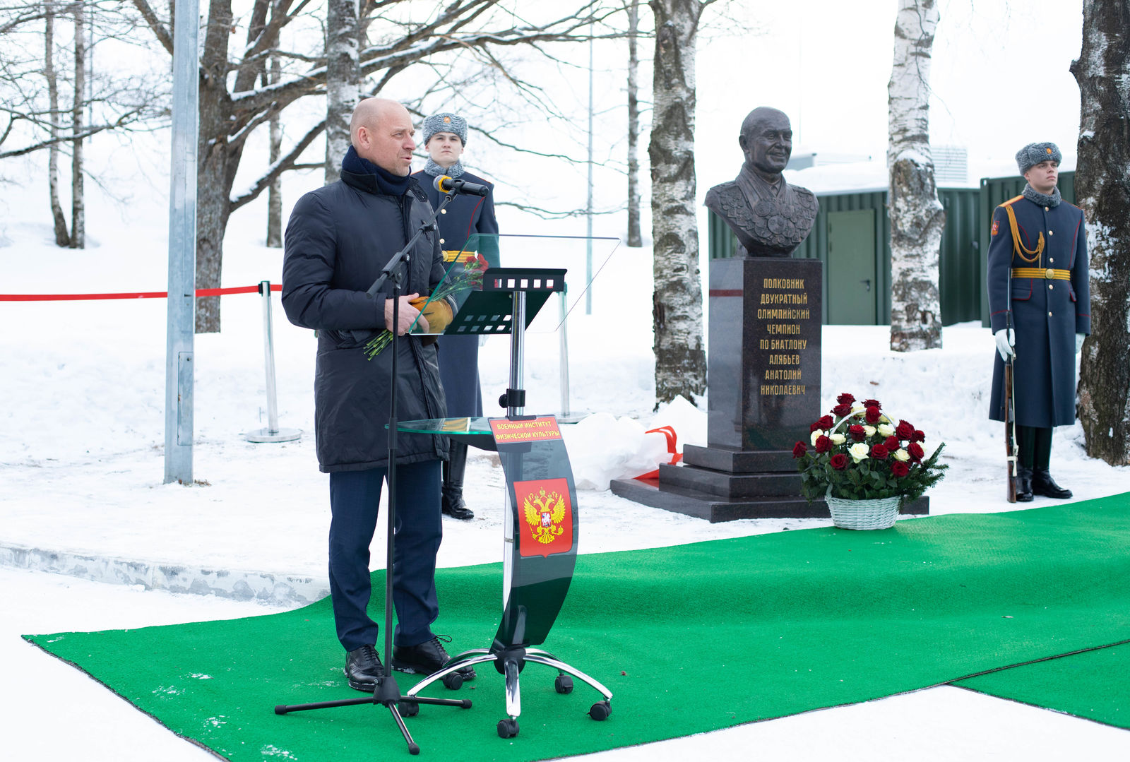 На торжественной церемонии открытия бюста присутствовали: начальник Военного института физической культуры генерал-майор Олег Боцман; заместитель начальника Управления физической подготовки и спорта Вооруженных сил РФ Владимир Неваев; начальник Центрального спортивного клуба Армии, мастер спорта по военно-спортивному многоборью, полковник Артём Громов; двукратная Олимпийская чемпионка по биатлону, заместитель начальника Центрального спортивного клуба Армии по военно-политической работе, полковник Светлана Ишмуратова; военный прокурор Санкт-Петербургского гарнизона, полковник юстиции Сергей Гарбуз; председатель Комитета по физической культуре и спорту Правительства Санкт-Петербурга Антон Шантырь; председатель Олимпийского совета Санкт-Петербурга, депутат Законодательного Собрания Санкт-Петербурга седьмого созыва Юрий Авдеев; президент Спортивной Федерации Биатлона Санкт-Петербурга Дмитрий Васильев; Герой Российской Федерации, шестикратная олимпийская чемпионка по лыжным гонкам, трёхкратная чемпионка мира Любовь Егорова; представители Спортивной роты ЦСКА и Совета ветеранов спорта ЦСКА, г. Санкт-Петербург, а также родные и близкие легендарного спортсмена, олимпийские чемпионы разных лет, курсанты и офицеры института, спортсмены.