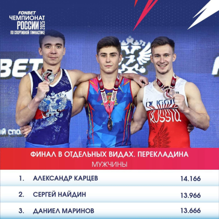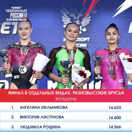 • Мельникова Ангелина: многоборье лично, командный зачет, разновысокие брусья, вольные упражнения — 3 медали;