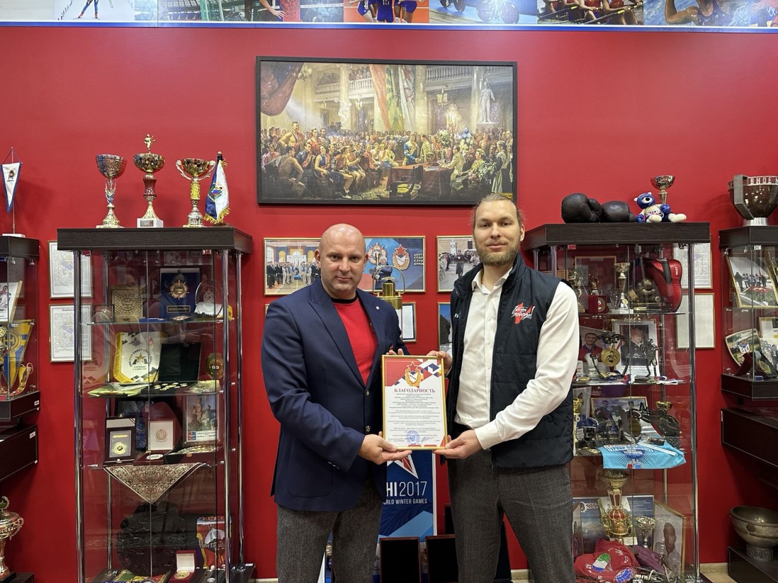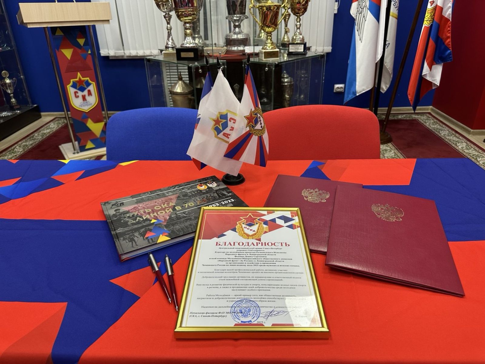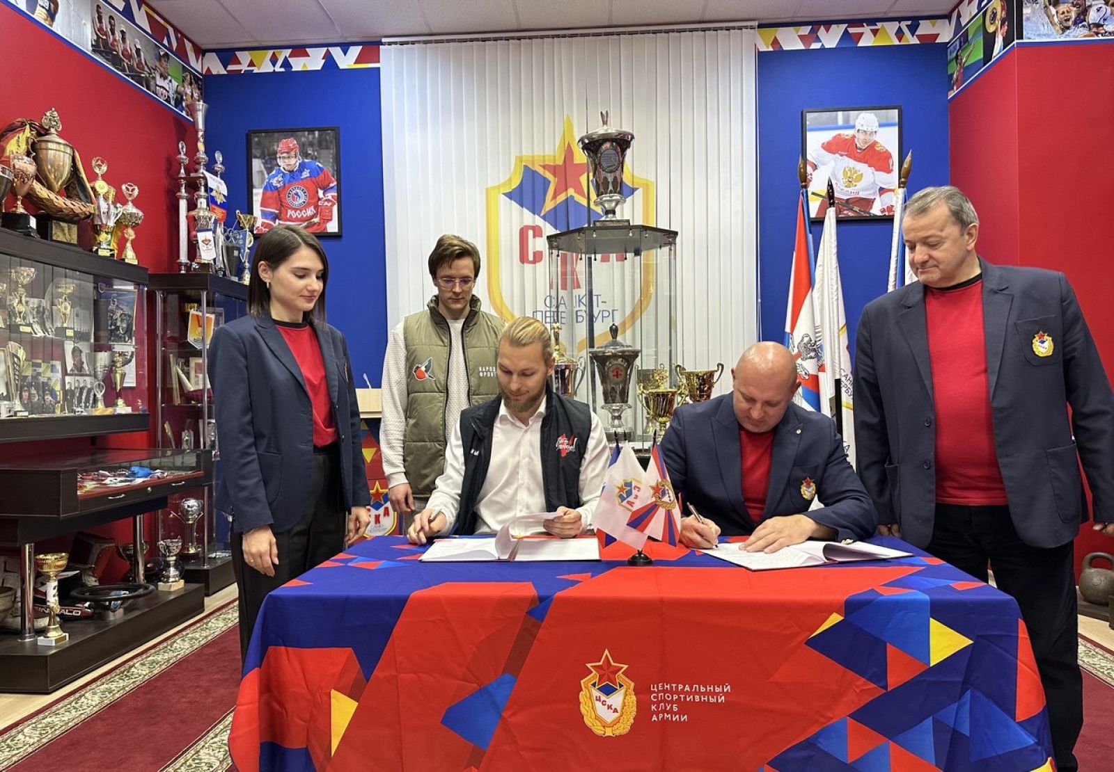 В Санкт-Петербурге на базе СК (ул. Инженерная) в музее славы СКА состоялась рабочая встреча, в которой приняли участие заместитель начальника филиала ФАУ МО РФ ЦСКА (СКА, г. Санкт-Петербург) Андрей Шаталов и куратор по молодёжным проектам Регионального Исполкома Народного фронта в Ленинградской области Денис Феденко.