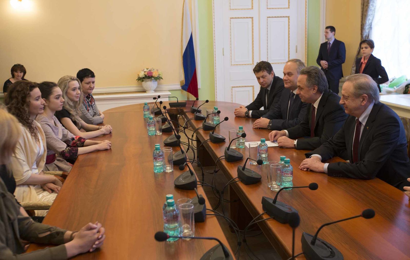 Приветствуя фигуристок и тренеров, Виталий Мутко поблагодарил их за прекрасное выступление на чемпионате мира, за ту радость, которую они подарили своим болельщикам. «Вы – лидеры не только России, но и мирового спорта. Ваши успехи особенно ценны в свете негативного информационного фона, сложившегося вокруг российского спорта. Мы создаем, и будем создавать для вас все необходимые условия для успешной подготовки к зимним Олимпийским играм 2018 года в Южной Корее, – подчеркнул министр.