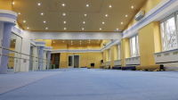Для занятий и тренировок в зале имеются гимнастическое бревно, перекладина, мужские брусья, кольца, разновысокие брусья, гимнастический конь для прыжков, гимнастический козел и гимнастический «ковер» размером 12х12 метров.